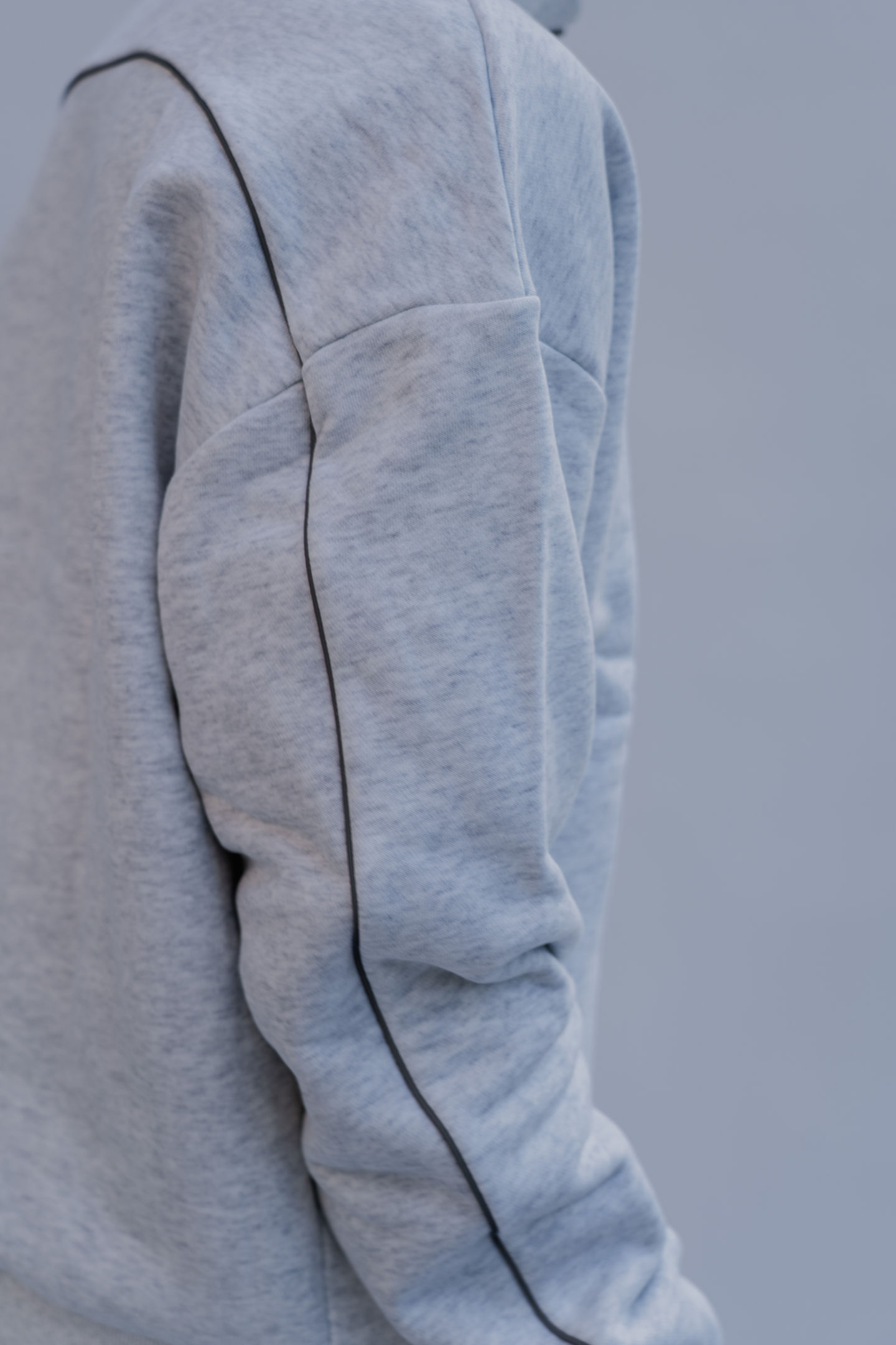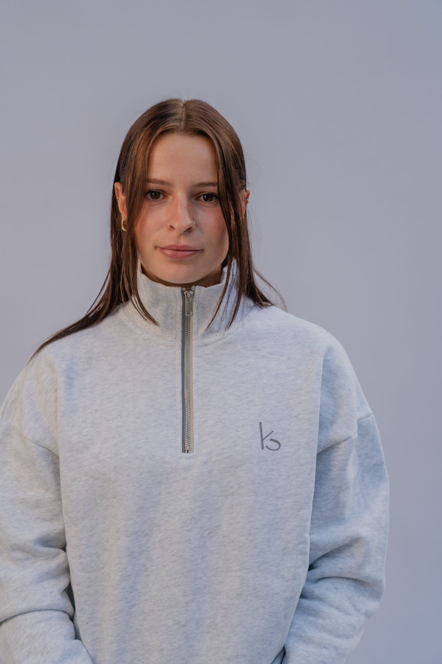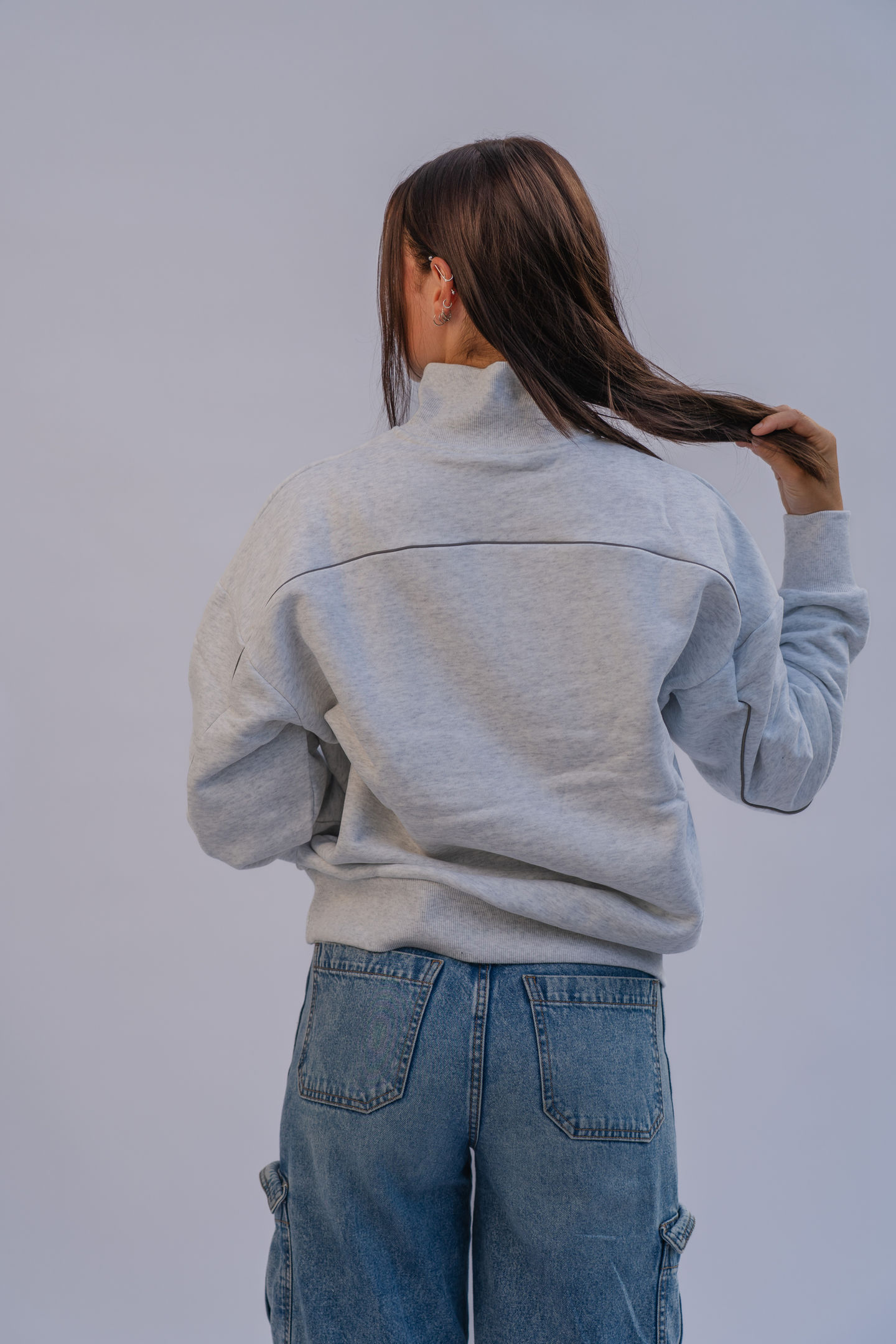 Deze unisex 1/4 zip sweater in lichtgrijs combineert comfort met een subtiele reflectieve afwerking.